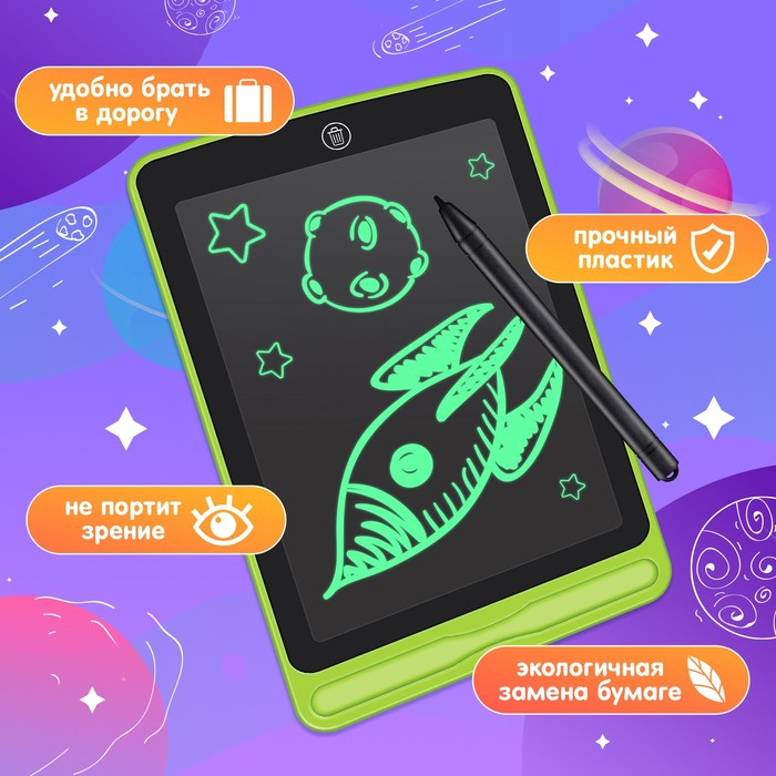 Детский планшет для рисования LED оживляет любые фантазии. У маленького затейника есть экран и волшебная ручка, а значит, он может отправиться к звёздам, повстречать космонавта или увидеть планету.