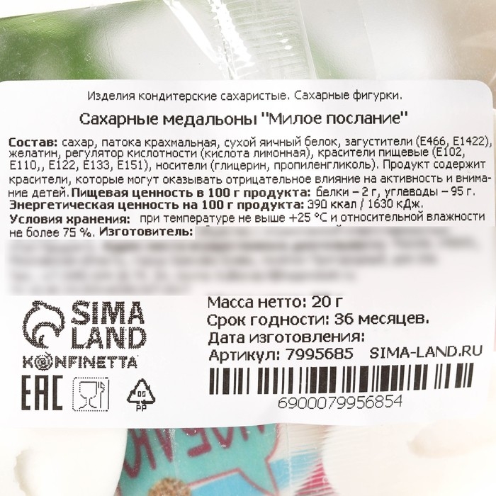 Состав: сахар, патока крахмальная, сухой яичный белок, загустители (Е466, Е1422), желатин, регулятор кислотности (кислота лимонная), красители пищевые (Е102, Е110, Е122, Е133, Е151), носители (глицерин, пропиленгликоль).