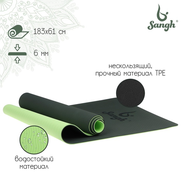 Коврик для йоги Sangh, 183×61×0,6 см, цвет тёмно-зелёный
