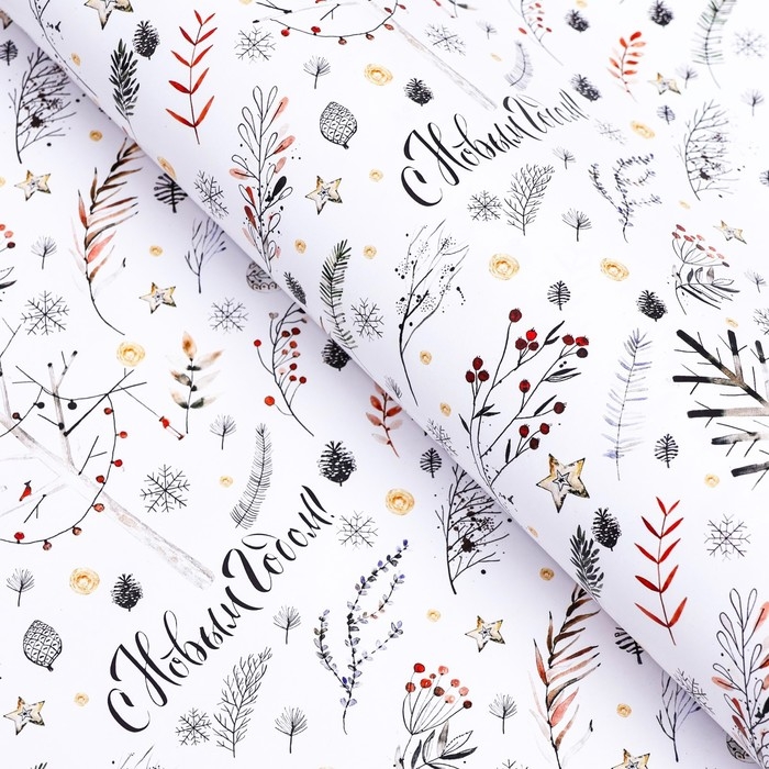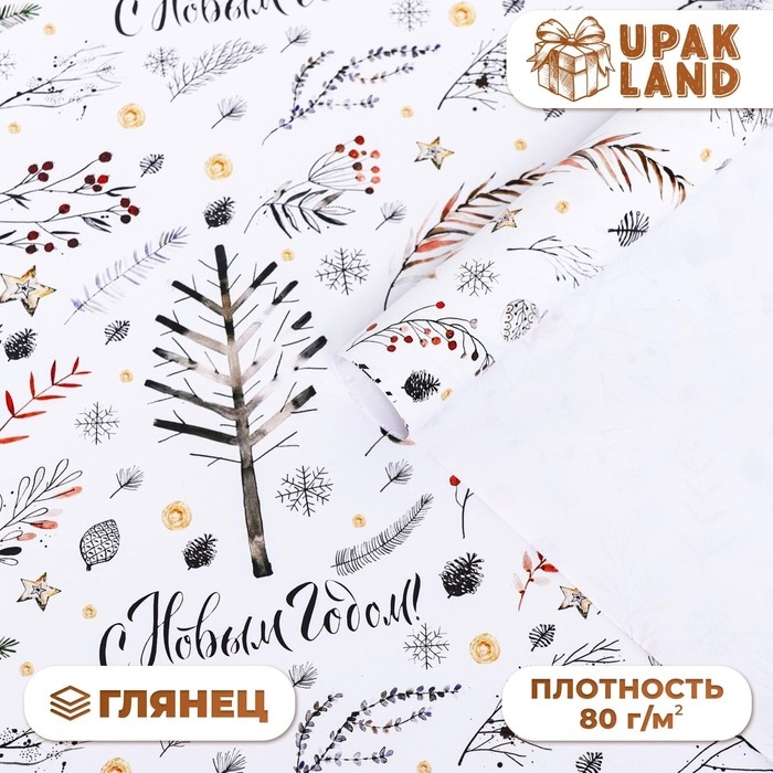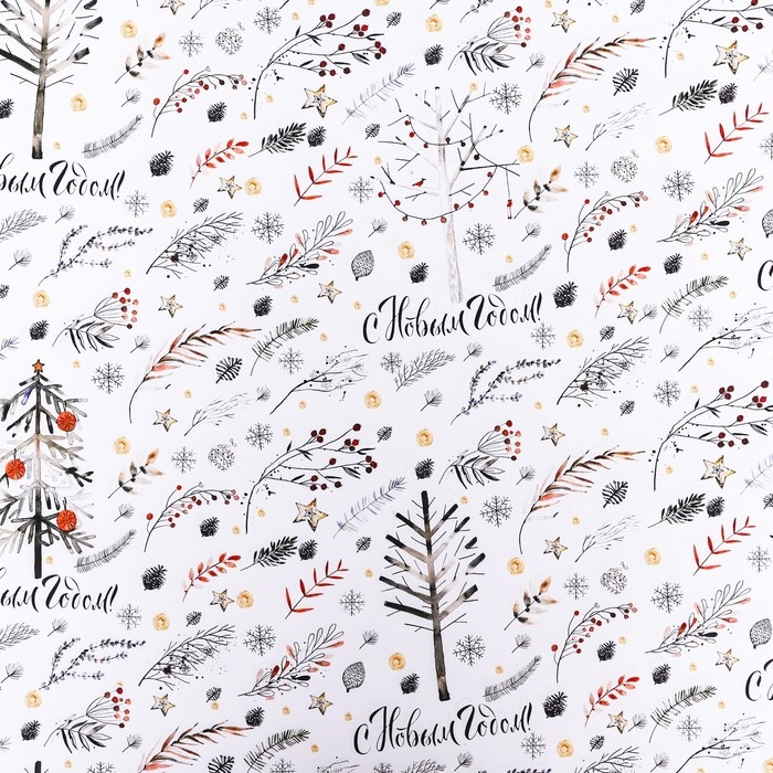 Новый год. Бумага упаковочная новогодняя глянцевая "Веточки ", 70 х 100 см.