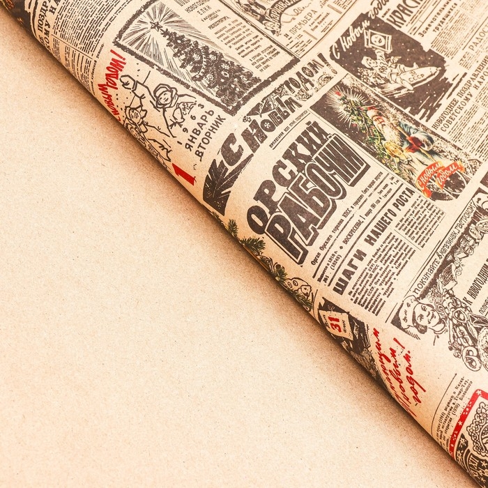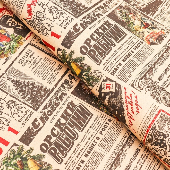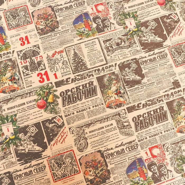 Новый год. Бумага упаковочная новогодняя крафт бурый " Газета советская", 70 х 100 см.