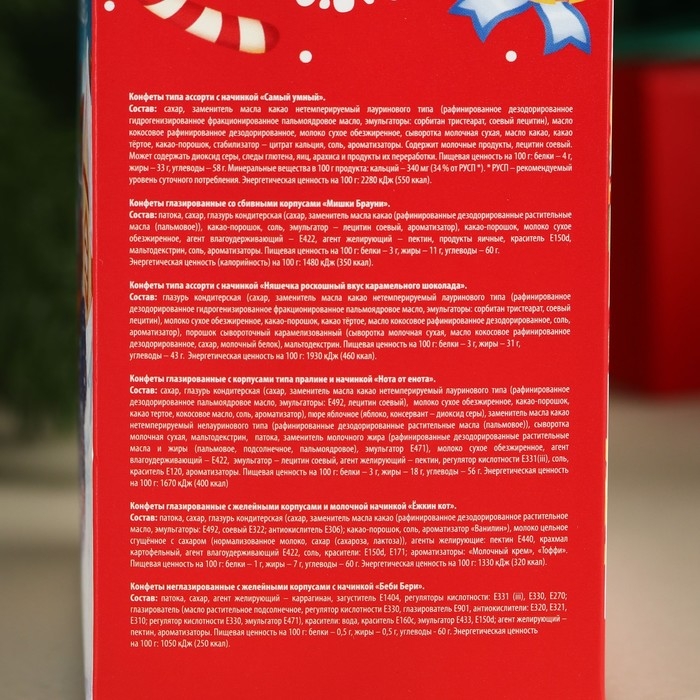 Состав: патока, сахар, глазурь кондитерская (сахар, заменитель масла какао (рафинированное дезодорированное растительное масло, эмульгаторы: Е492, соевый Е322; антиокислитель Е306); какао-порошок, соль, ароматизатор «Ванилин»), молоко цельное сгущённое с сахаром (нормализованное молоко, сахар (сахароза, лактоза)), агенты желирующие: пектин Е440, крахмал картофельный, агент влагоудерживающий Е422, соль, красители: Е150d, Е171; ароматизаторы: «Молочный крем», «Тоффи».