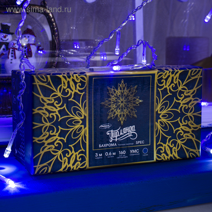 Гирлянда «Бахрома» 3 × 0.6 м, IP44, УМС, прозрачная нить, 160 LED, свечение синее, мерцание белым, 220 В