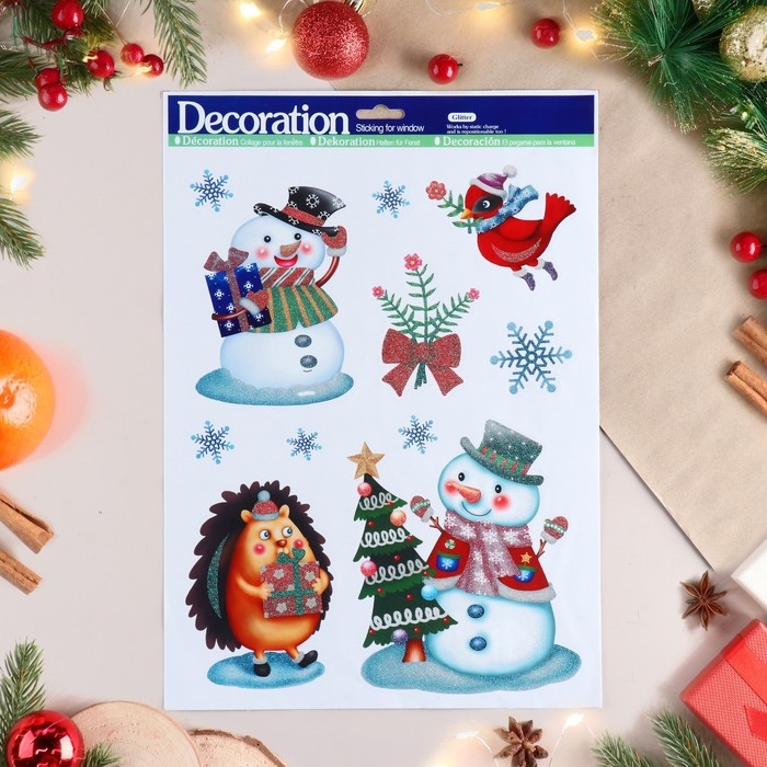 Наклейки на окна "Новогодние" снеговик, ёжик, ёлка