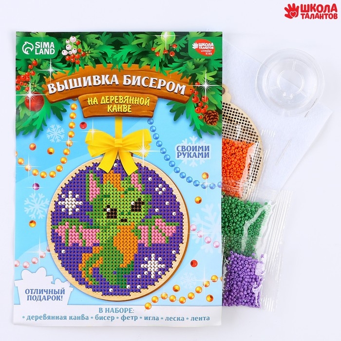 Вышивка бисером на деревянной подвеске на новый год «Дракоша», новогодний набор для творчества