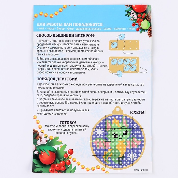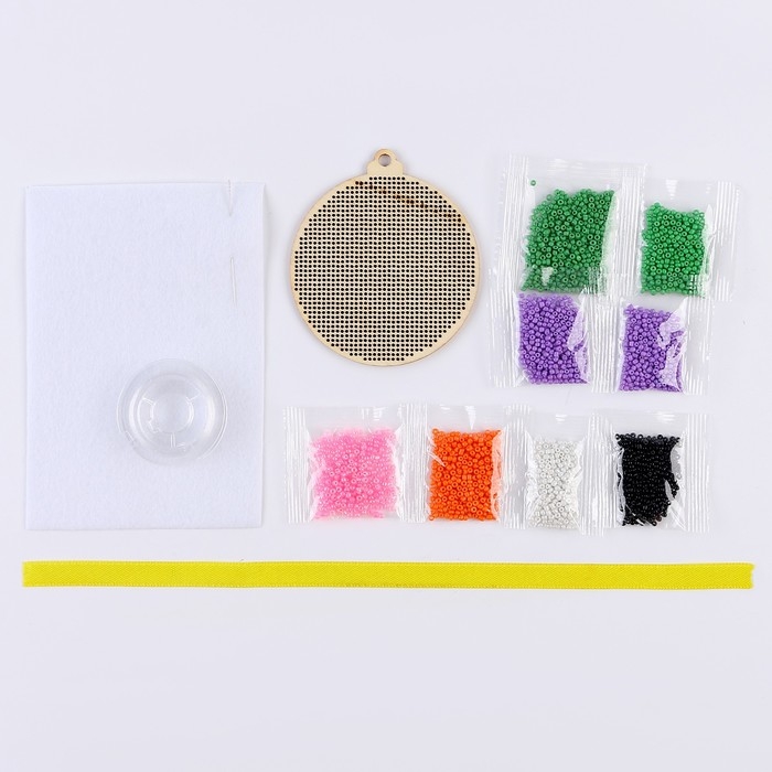 - Внутри вы найдёте деревянную основу, бисер, фетр, иглу, леску и ленточку.
