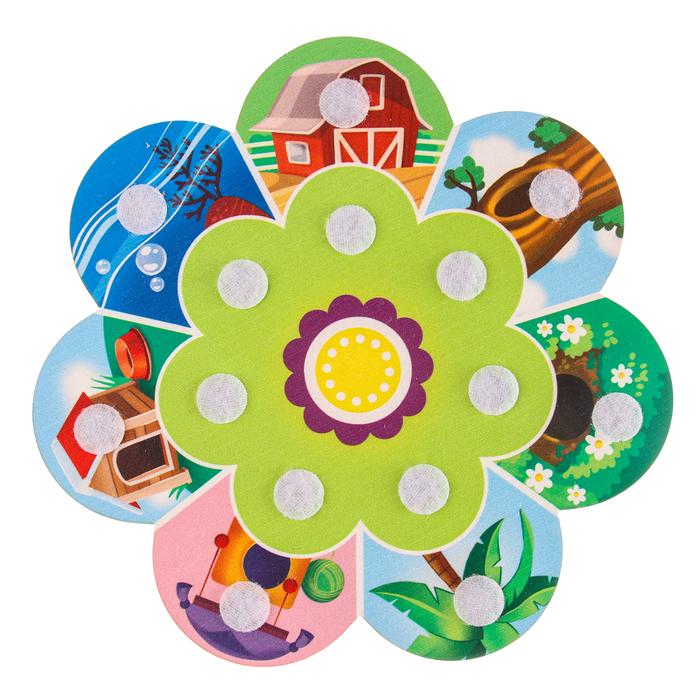 Перед началом игры освободите круг от липучек, попросите малыша назвать всех животных и элементы, обозначающие еду. Затем дайте ребёнку самостоятельно прикрепить животное к месту его обитания. Когда малыш будет брать липучку с каким-то животным, спросите, что он о нём знает, где встречал/видел.