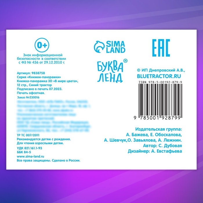 - Персонажи из популярного мультфильма «Синий трактор» сделают знакомство с миром цвета ещё более захватывающим, а объёмные картинки зверушек, оживших на страницах книги, увеличат интерес ребёнка к изучению цвета и окружающего мира.