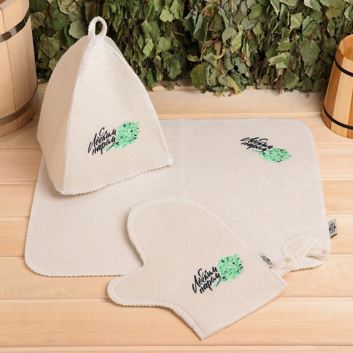 Для комфортного отдыха в парной возьмите с собой набор банных принадлежностей. Предметы из этого комплекта предохраняют тело от перегрева и являются средствами индивидуального пользования. Влажные изделия рекомендуется сушить в расправленном виде на горизонтальной поверхности. Принадлежности из войлока и фетра стирайте вручную при температуре воды 30 °C.
