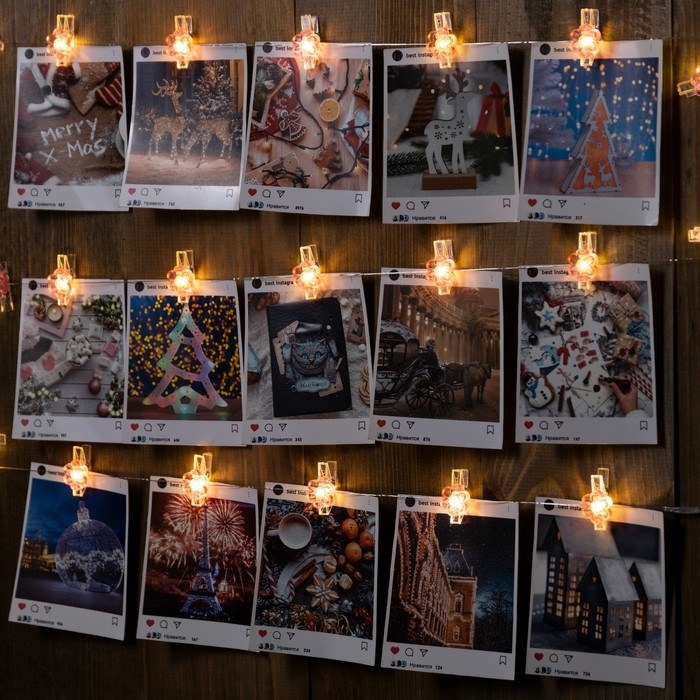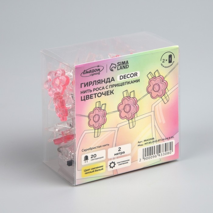 Гирлянда «Нить» 2 м роса с насадками «Прищепки-цветы», IP20, серебристая нить, 20 LED, батарейки ААх2 (нет в комплекте), свечение тёплое белое