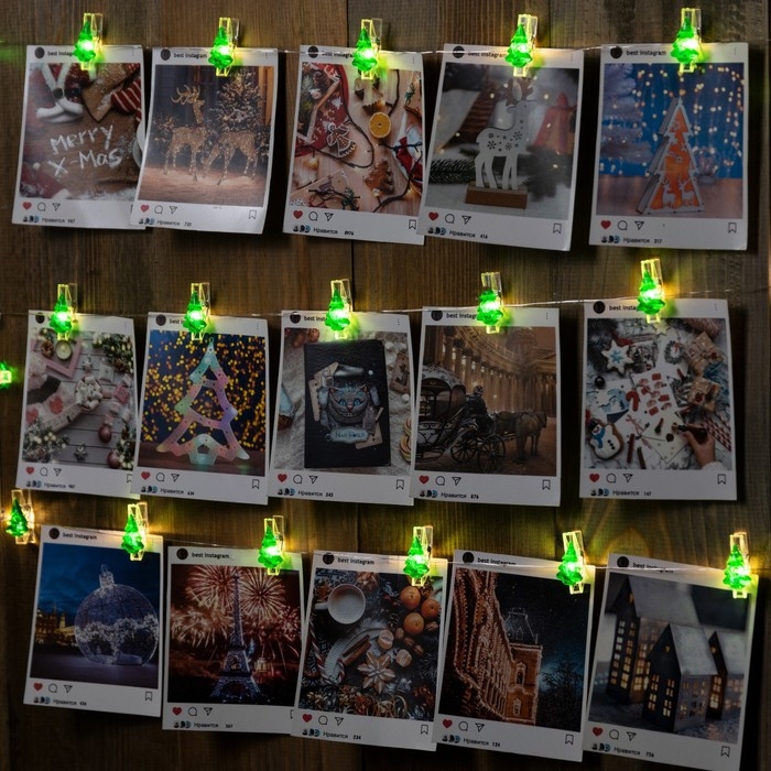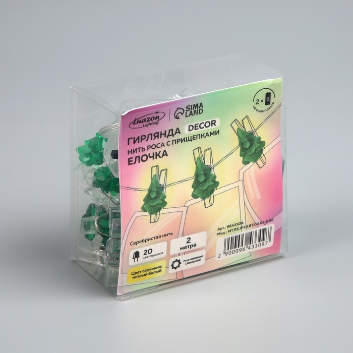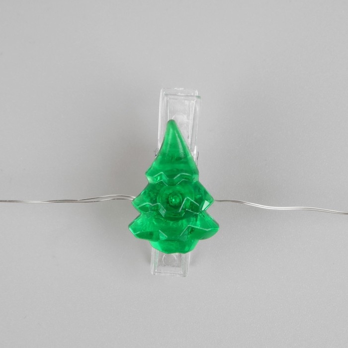 Гирлянда «Нить» 2 м роса с насадками «Прищепки-ёлочки», IP20, серебристая нить, 20 LED, батарейки ААх2 (не в комплекте), свечение тёплое белое