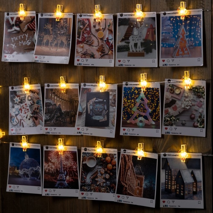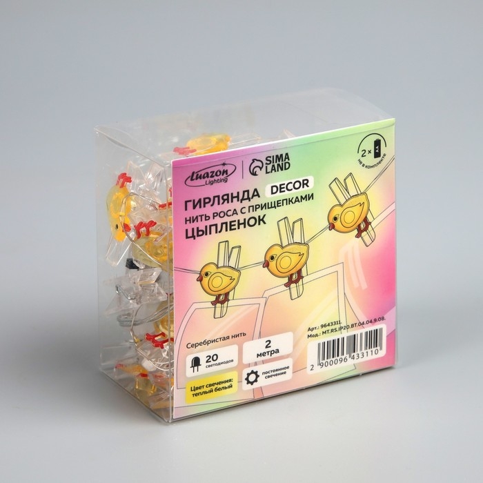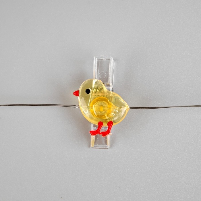 Гирлянда «Нить» 2 м роса с насадками «Прищепки-цыплёнок», IP20, серебристая нить, 20 LED, батарейки ААх2 (нет в комплекте), свечение тёплое белое