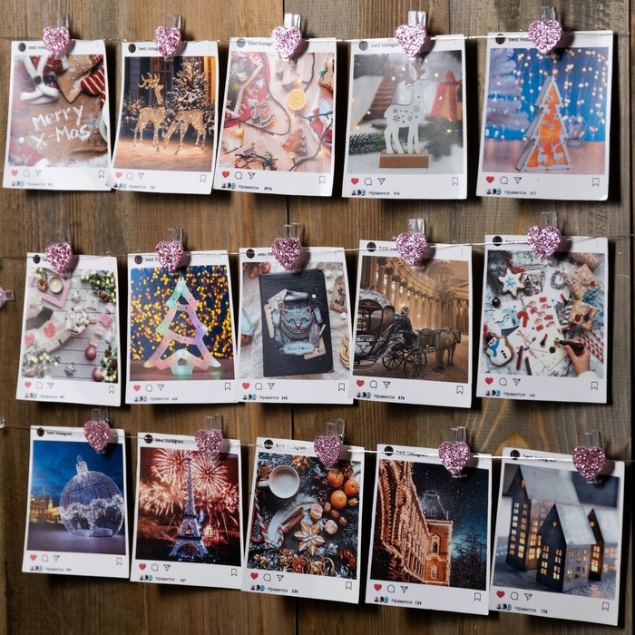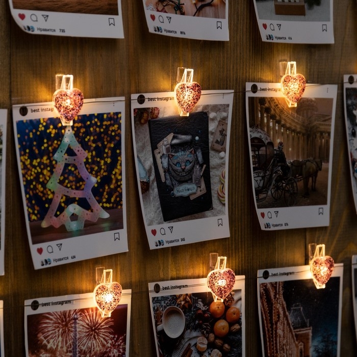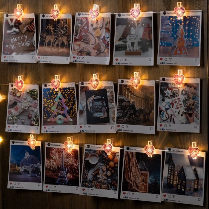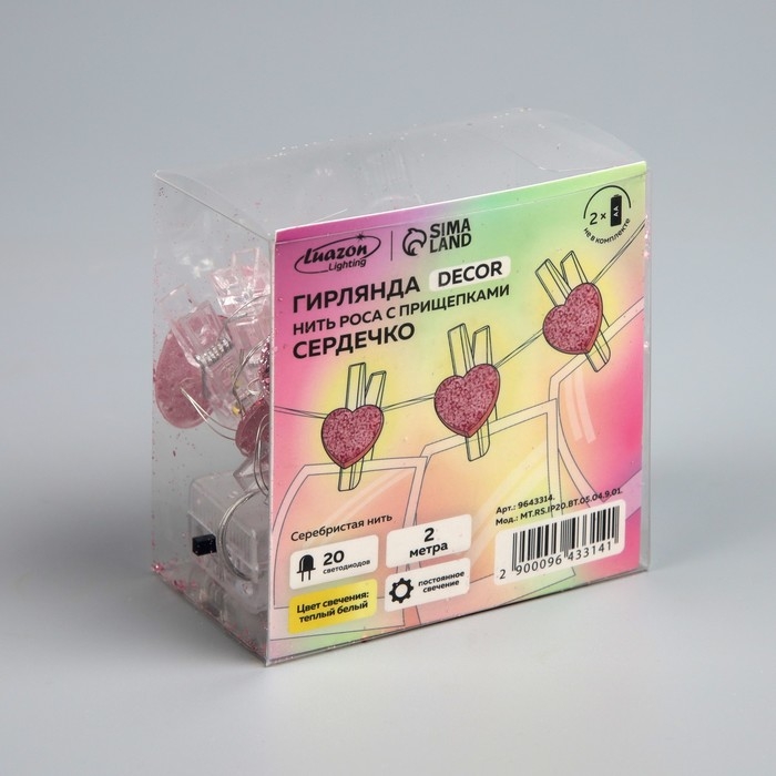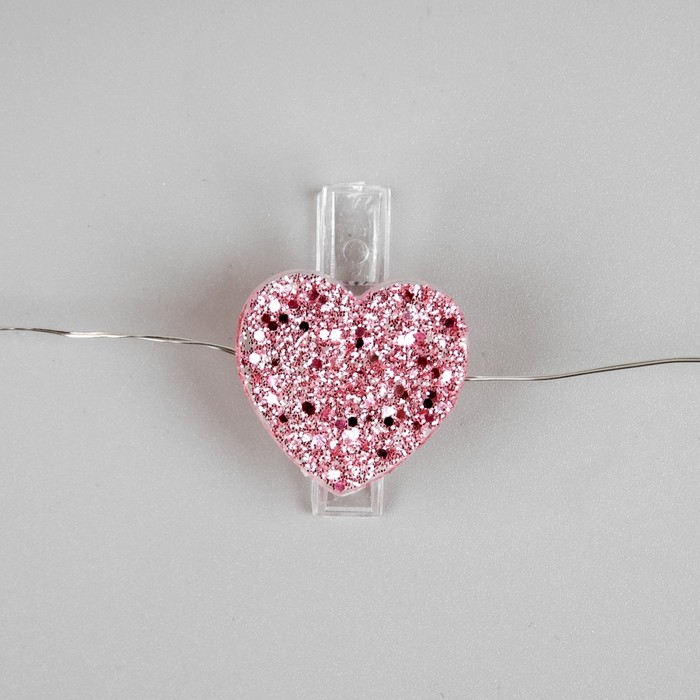 Гирлянда «Нить» 2 м роса с насадками «Прищепки-сердечко», IP20, серебристая нить, 20 LED, батарейки ААх2 (не в комплекте), свечение тёплое белое