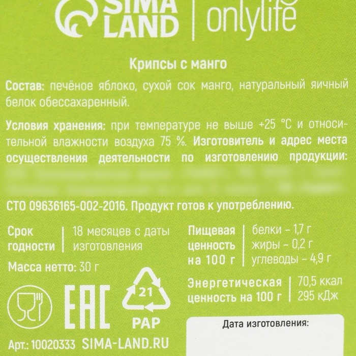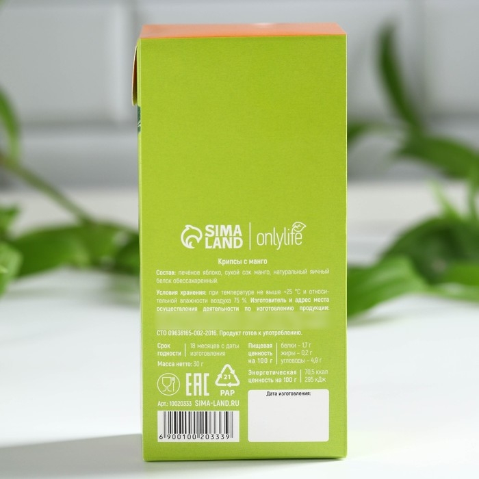 Состав: печёное яблоко, сухой сок манго, натуральный яичный белок обессахаренный.