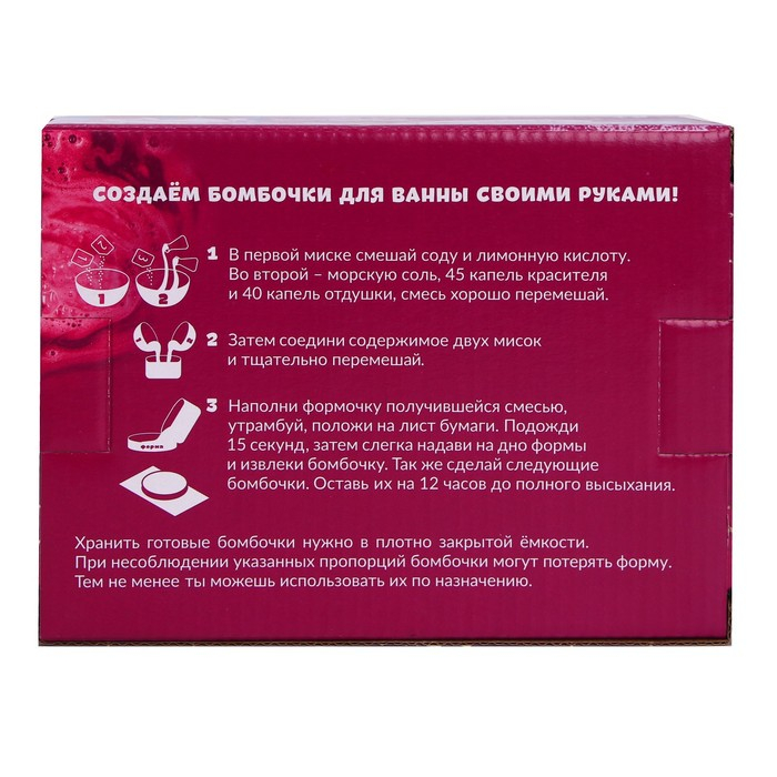 Набор для творчества создан специально для того, чтобы вы могли самостоятельно, следуя инструкции, создать бурлящие шарики для ванной! Необходимые атрибуты идут в наборе, а простая и понятная инструкция присутствует на обороте упаковки - все, что осталось сделать, дак это начать маленький творческий эксперимент.
