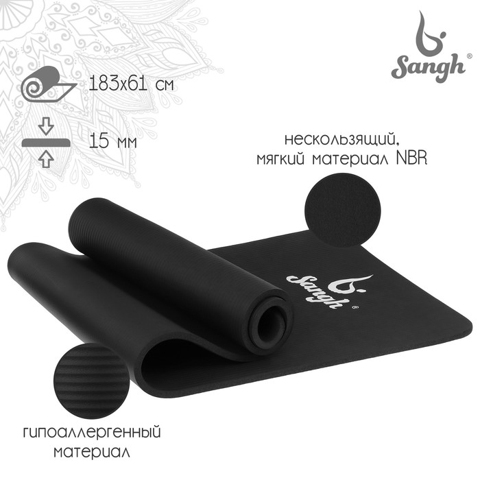Коврик для йоги Sangh, 183×61×1,5 см, цвет чёрный