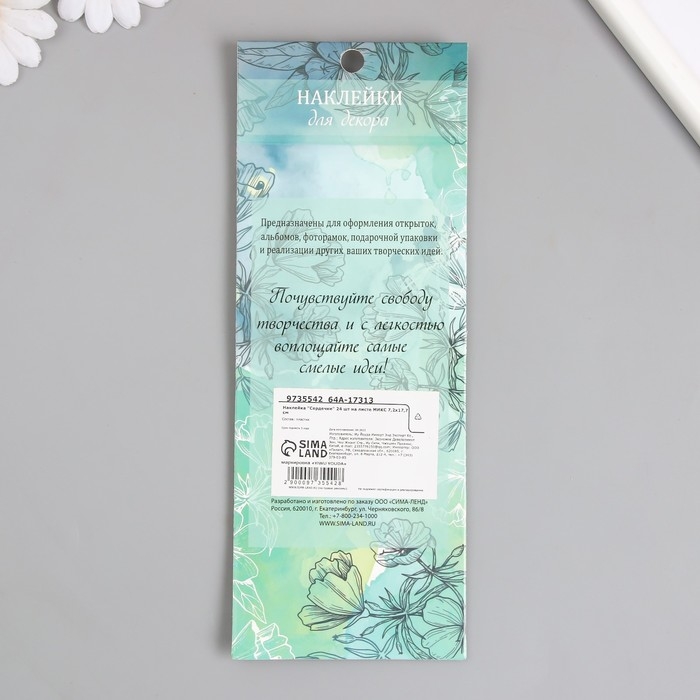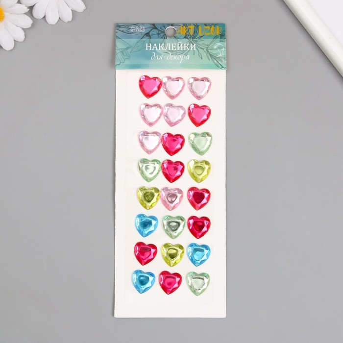 Наклейка пластик стразы "Сердечки" 24 шт на листе МИКС 7,2х17,7 см