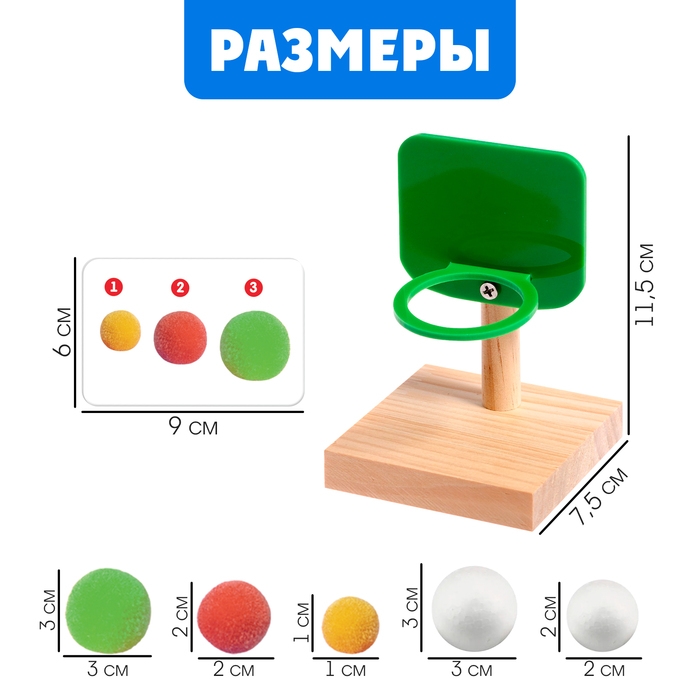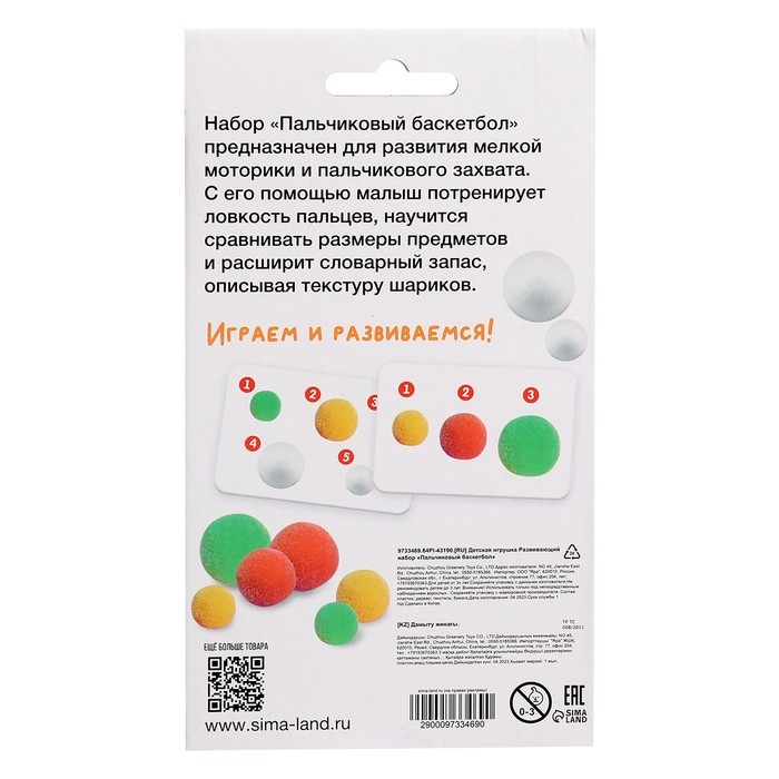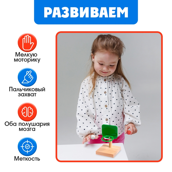 Развивающий набор «Пальчиковый баскетбол» предназначен для развития мелкой моторики и пальчикового захвата. С его помощью малыш потренирует ловкость пальцев, научится сравнивать размеры предметов и расширит словарный запас, описывая текстуру шариков.
