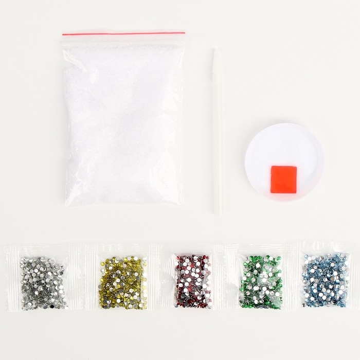 - Из пакетика с номером, который соответствует схеме, отсыпьте в ёмкость немного стразов.