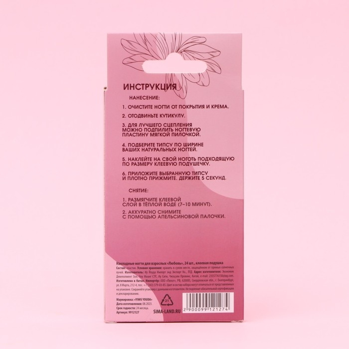 Накладные ногти держатся до двух недель в зависимости от способа крепления и интенсивности воздействия на ногти в процессе носки. Можно использовать клей для накладных ногтей (приобретается отдельно) – это увеличит срок носки. При бережном ношении ногти можно использовать несколько раз.