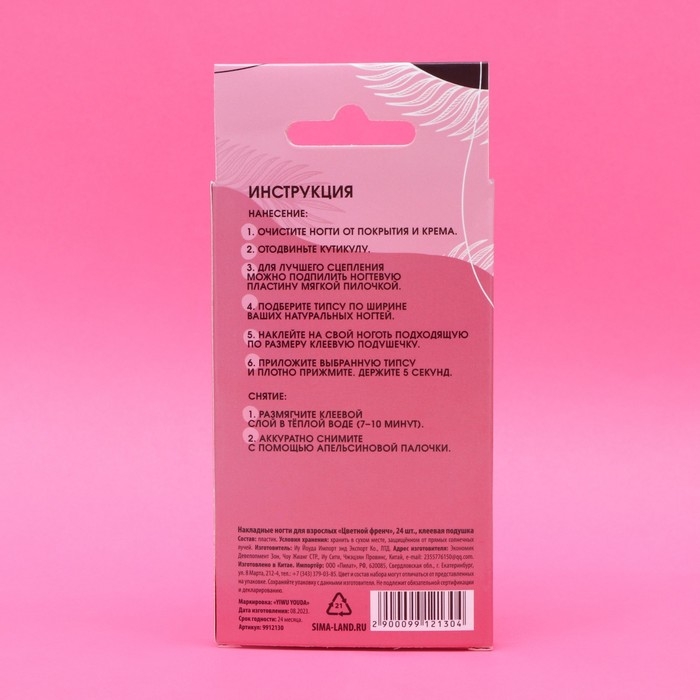 Накладные ногти держатся до двух недель в зависимости от способа крепления и интенсивности воздействия на ногти в процессе носки. Можно использовать клей для накладных ногтей (приобретается отдельно) – это увеличит срок носки. При бережном ношении ногти можно использовать несколько раз.