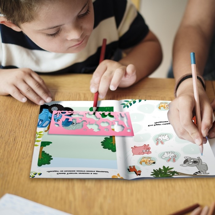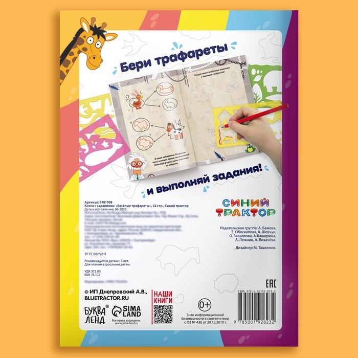 Набор «Веселые трафареты»: книга с заданиями, 32 стр., А4, + 4 трафарета, Синий трактор