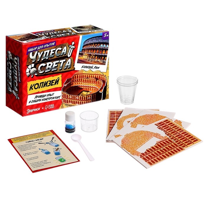 С набором для опытов «Чудеса света: Колизей» ребёнок своими руками соберёт модель известной итальянской арены, узнает о ней несколько интересных фактов, а также проведёт увлекательный опыт по химии и увидит, как взаимодействуют два вещества.
