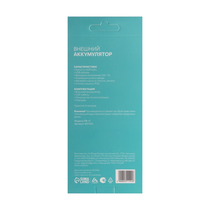 Внешний аккумулятор Luazon PB-17, 4000 мАч, USB, 1 А, индикатор, тонкий корпус,металл,чёрный