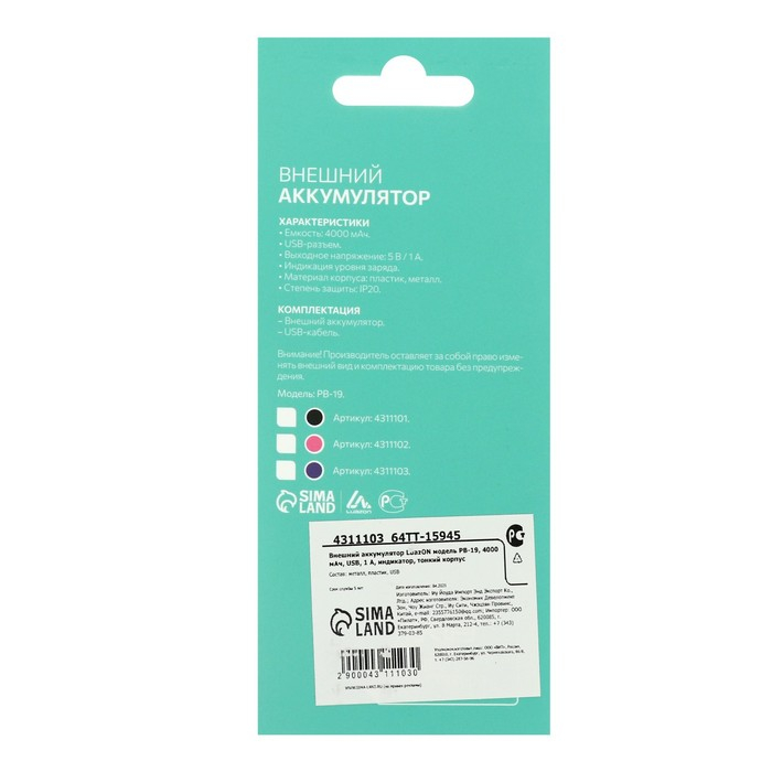 Внешний аккумулятор Luazon модель PB-11, USB, 7200 мАч, 1 A, индикатор зарядки, МИКС