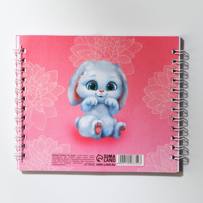 Двойной блокнот на гребне, мягкая обложка, размер 15х12см, 48 л «Зайчик»