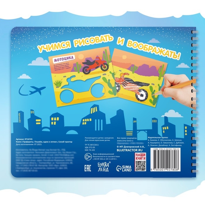 Книга «Трафареты. Плывём, едем и летим», Синий трактор, трафарет в листе книжки — 8 шт., 3+