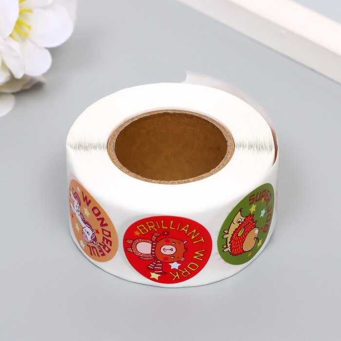 Наклейка бумага "Радостные зверята" d=2,5 см 500 шт в рулоне 3х6х6 см