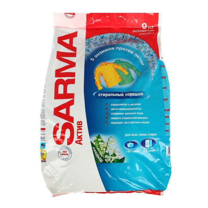 Стиральный порошок Сарма Актив Ландыш 9 кг, предназначен для всех типов стирки. 5 Энзимов против пятен. Легко выполаскивается, сохраняет волокна тканей, защищает стиральную машину от накипи,подходит для цветных тканей. Антибактериальный эффект без хлора.