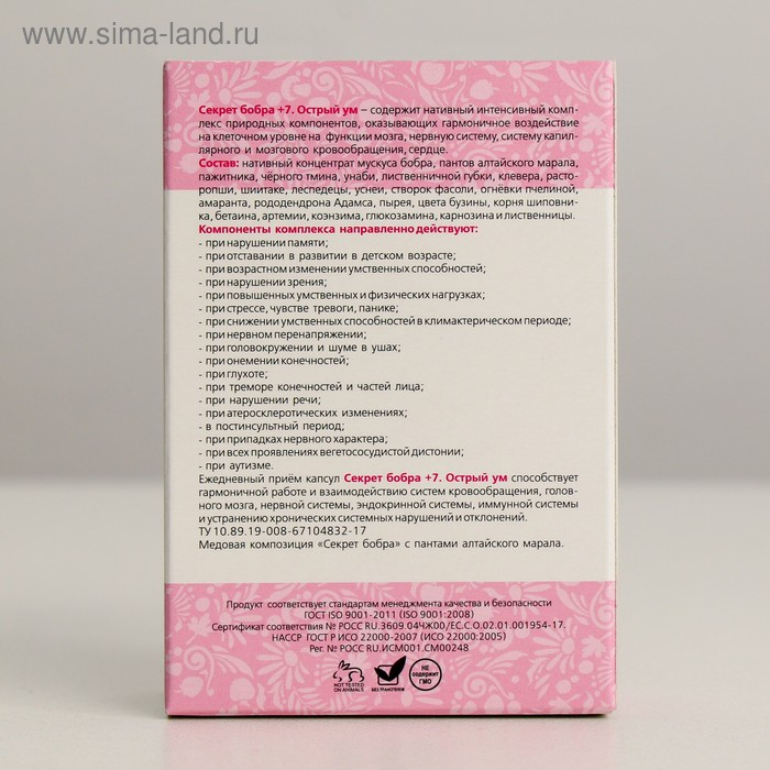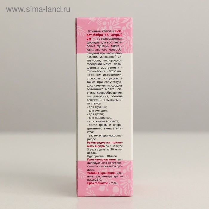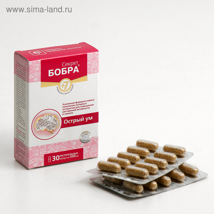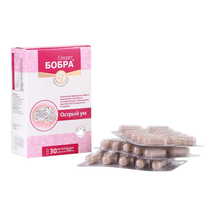 Секрет бобра® +7. Острый ум – содержит нативный интенсивный комплекс природных компонентов, оказывающих гармоничное воздействие на клеточном уровне на функции мозга, нервную систему, систему капиллярного и мозгового кровообращения, сердце.