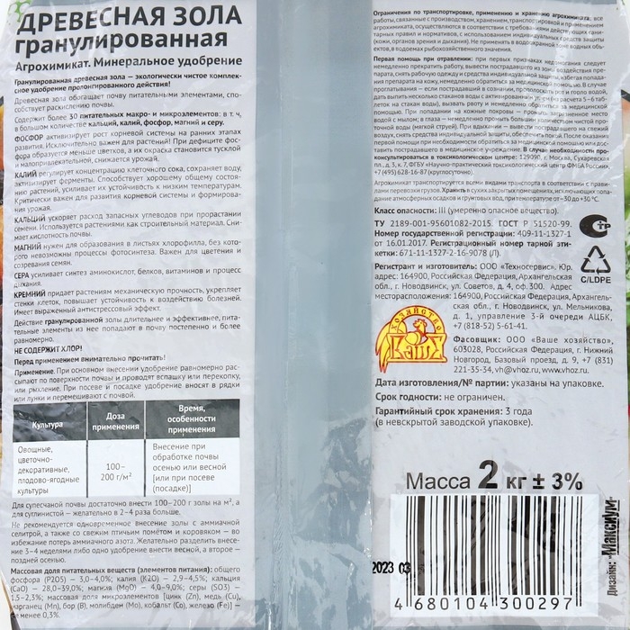 Гранулированная древесная зола — экологически чистое комплексное удобрение пролонгированного действия!Древесная зола обогащает почву питательными элементами, способствует раскислению почвы.Содержит более 30 питательных макро- и микроэлементов: в т.ч. в большом количестве кальций, калий, фосфор, магний и серу.ФОСФОР активизирует рост корневой системы на ранних этапах развития. Исключительно важен для растений! При дефиците фосфора образуется меньше цветков, а их окраска становится тусклой и малопривлекательной, снижается урожай.КАЛИЙ регулирует концентрацию клеточного сока, сохраняет воду, активизирует ферменты. Способствует хорошему общему состоянию растений, усиливает их устойчивость к низким температурам. Критически важен для развития корневой системы и формирования урожая.КАЛЬЦИЙ ускоряет расход запасных углеводов при прорастании семени. Используется растениями, как строительный материал. Снимает кислотность почвы.МАГНИЙ нужен для образования в листьях хлорофилла, без которого невозможны процессы фотосинтеза. Важен для цветения и созревания семян.СЕРА усиливает синтез аминокислот, белков, витаминов и процесс дыхания.КРЕМНИЙ предает растениям механическую прочность, укрепляет стенки клеток, повышает устойчивость к воздействию болезней. Имеет выраженный антистрессовый эффект.Действие гранулированной золы длительнее и эффективнее, питательные элементы из нее попадают в почву постепенно и более равномерно.НЕ СОДЕРЖИТ ХЛОР!