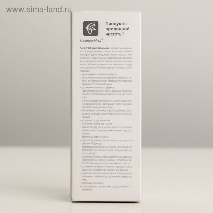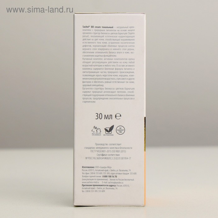 Sachel® BB cream тональный – натуральный крем-комплекс с природным пигментом на основе мицелл органелло-структур биомассы цветков бархатцев (Tagetes patual), оказывающий эстетическое корректирующее действие на цвет кожи, способствующий выравниванию естественного тона кожи, устранению косметических дефектов, нормализации обменных процессов клеток верхнего слоя эпидермиса и нижнего слоя дермы, обеспечению оптимального баланса влаги в коже, восстановлению защитных функций кожи.