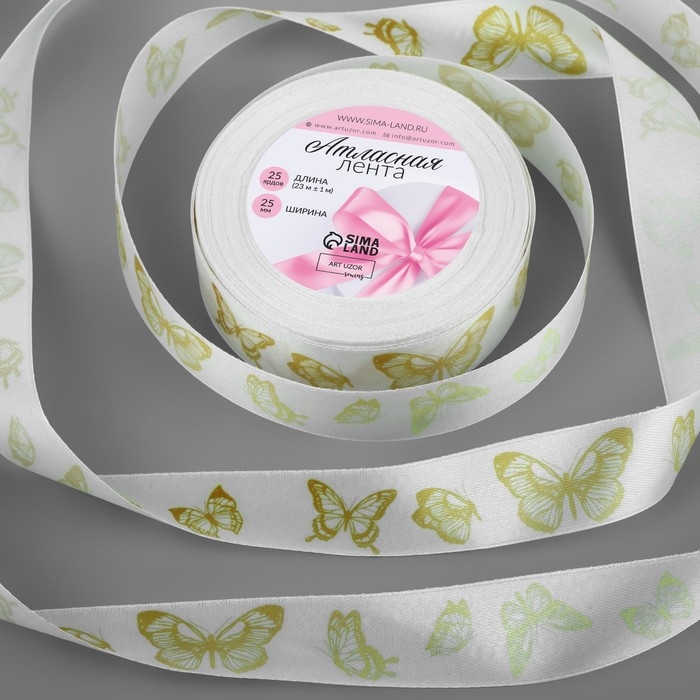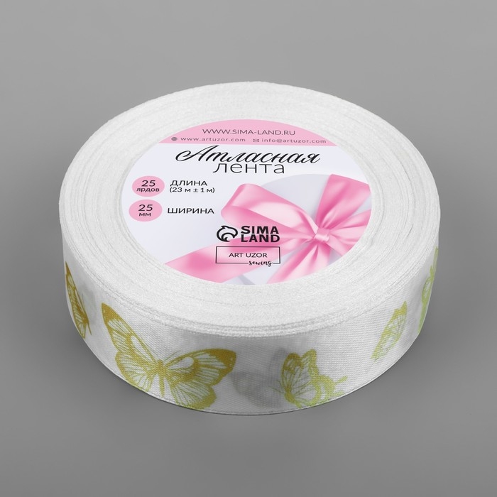 Лента атласная «Золотые бабочки», 25 мм, 23 ± 1 м, цвет белый