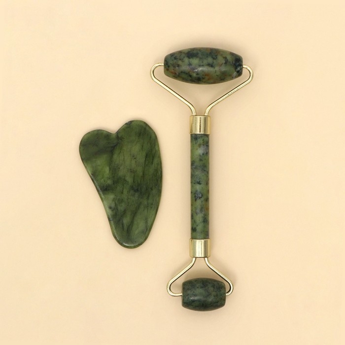 В набор входит роликовый массажёр из кальцита и серпентина и массажёр гуаша. Оба предмета помогают снять отёчность лица, уменьшить количество морщин, подтягивают кожу, тонизируют её. Массажёр гуаша полезен ещё и тем, что благодаря своей форме помогает избавиться от тёмных кругов под глазами.