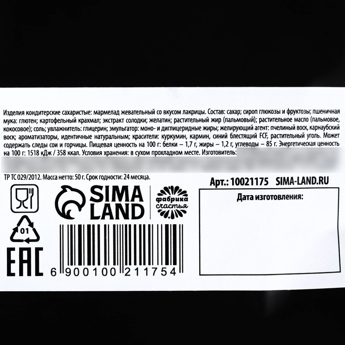 Состав: сахар; сироп глюкозы и фруктозы; пшеничная мука: глютен; картофельный крахмал; экстракт солодки; желатин; растительный жир (пальмовый); растительное масло (пальмовое, кокосовое); соль; увлажнитель: глицерин; эмульгатор: моно- и диглицеридные жиры; желирующий агент: пчелиный воск, карнаубский воск; ароматизаторы, идентичные натуральным; красители: куркумин, кармин, синий блестящий FCF, растительный уголь.