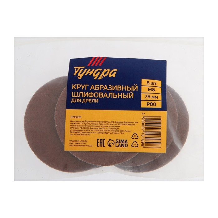 Круг абразивный шлифовальный ТУНДРА, для дрели, М8, 75 мм, Р80, 5 шт.