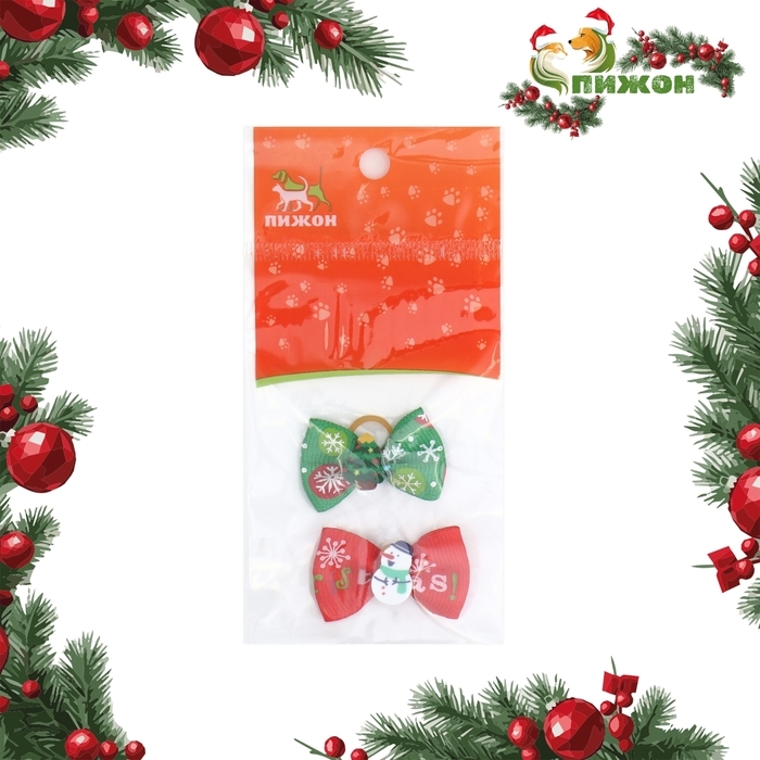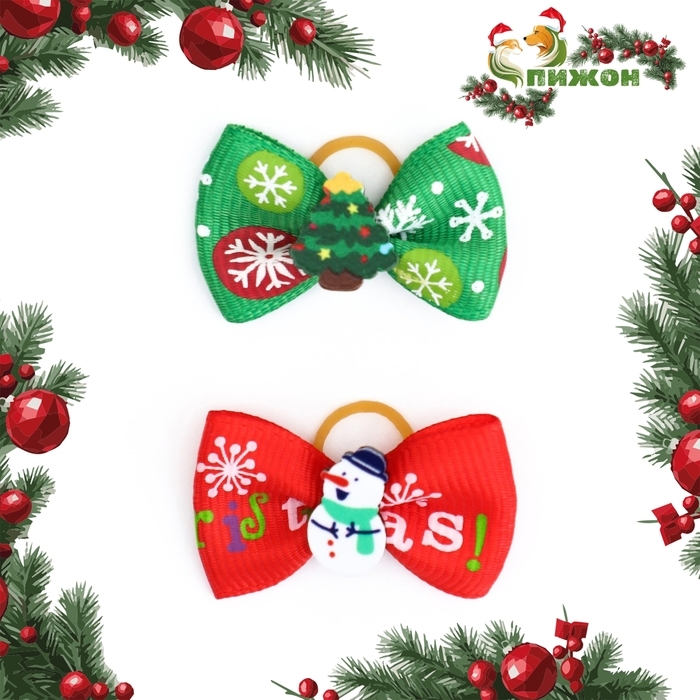 Новогодний набор бантиков-резинок "Ёлочка и Снеговик" - великолепное украшение для собачки. Множество цветовых гамм позволит подобрать бантик под любой наряд, который есть у вашего любимца. Такое украшение подойдет любой маленькой породе, главное длинношерстной. С помощью бантиков Вы можете легко и просто создать непревзойденный имидж питомца, сделать настоящего модника и просто упростить уход за шерсткой собачки - красиво и правильно уложить челку. Бантики выполнены из репсовых лент с добавлением новогоднего декора. Основа выполнена из качественного, прочного материала, который хорошо тянется. Резинки для собаки украсят Вашего питомца, создадут новогоднее настроение и не оставят никого равнодушным.
