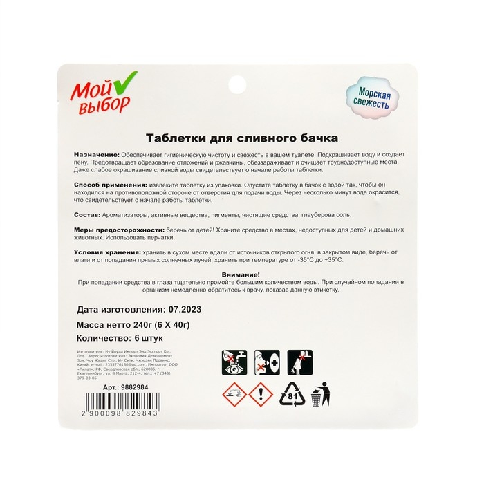 Таблетка для сливного бачка "Мой Выбор" предназначена для поддержания чистоты и свежести в туалетной чаше. Это эффективное и удобное средство обеспечивает не только освежающий аромат, но и предотвращает образование накипи и неприятных запахов.