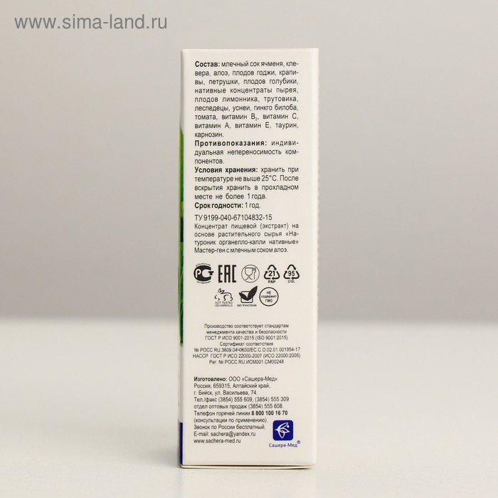 Состав: млечный сок ячменя, клевера, алоэ, плодов годжи, крапивы, петрушки, плодов голубики, нативный концентрат пырея, нативный концентрат плодов лимонника, нативный концентрат трутовика, нативный концентрат леспедецы, нативный концентрат уснеи, нативный концентрат гинкго билоба, нативный концентрат томата, карнозин, таурин, витамин В2, витамин С, витамин А, витамин Е.