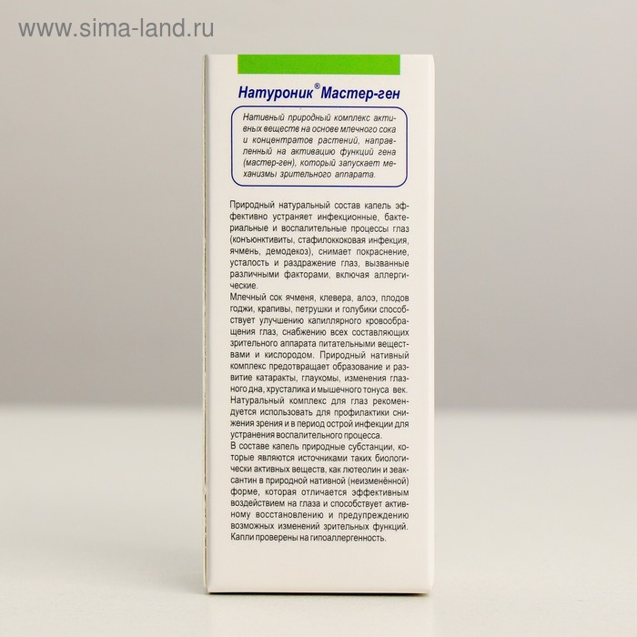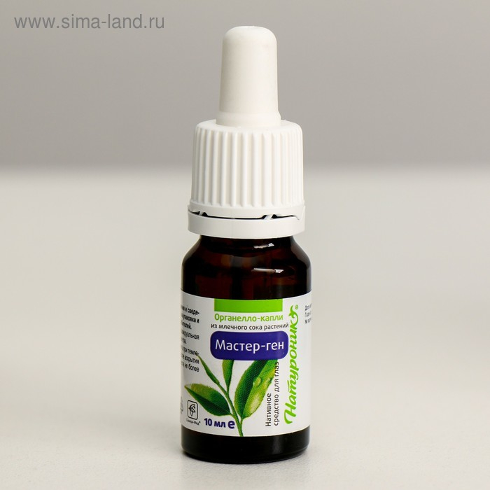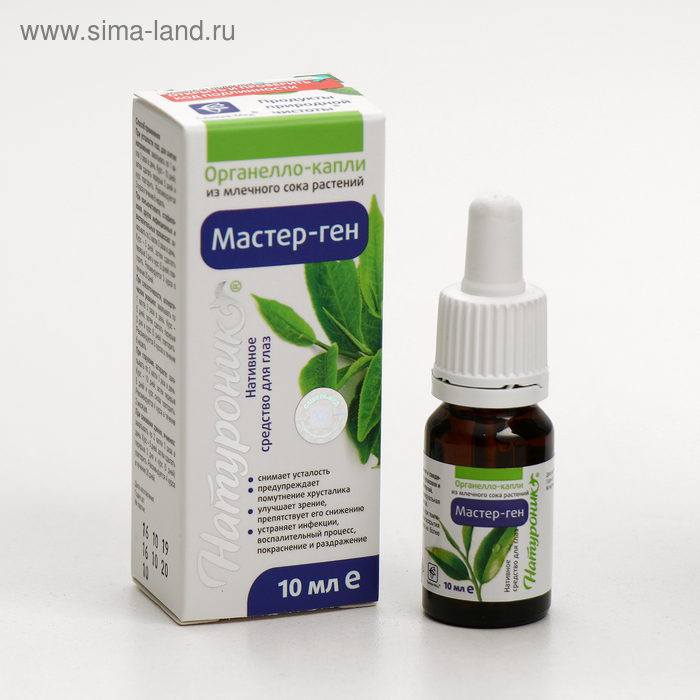 Натуроник® Мастер-ген, органелло-капли для глаз содержат природный комплекс млечного сока и концентратов растений, направленны на активацию функций гена (мастер-ген), который запускает механизмы зрительного аппарата и предупреждает изменения зрительного аппарата глаза. В составе капель содержится природный антиоксидант карнозин, который защищает глаза от разрушения светом, а также таурин, предупреждающий катаракту и глаукому. Природный натуральный состав капель эффективно устраняет инфекционные, бактериальные и воспалительные процессы глаз (конъюнктивит, стафилококковая инфекция, ячмень, демодекоз), снимает покраснение, слезоточивость, усталость и раздражение глаз, вызванные различными факторами, включая аллергические.