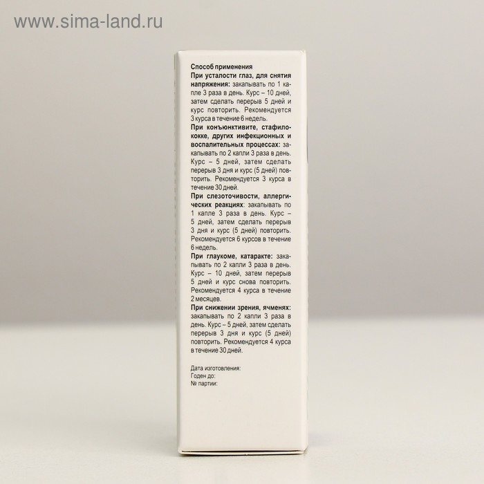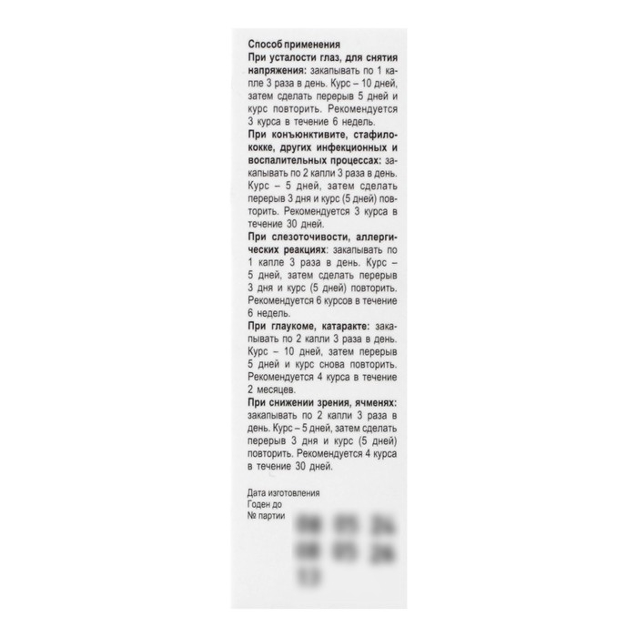 - При снижении зрения, ячменях: закапывать по 2 капли 3 раза в день. Курс – 5 дней, затем сделать перерыв 3 дня и курс (5 дней) повторить. Рекомендуется 4 курса в течение 30 дней. Один флакон рассчитан на 4 курса.