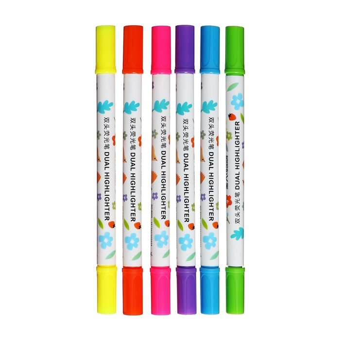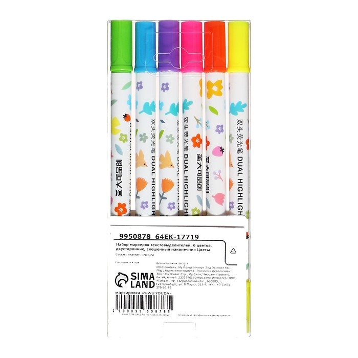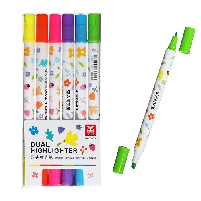 Набор маркеров текстовыделителей, 6 цветов, двусторонние, скошенный наконечник, Цветы
