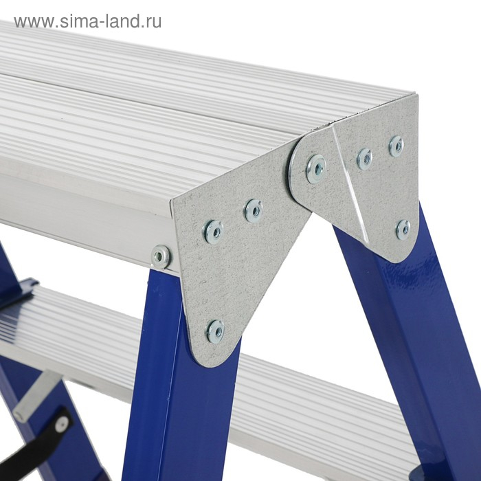 Стремянка выполнена из лёгких, но прочных материалов: каркас — из окрашенной стали, ступени — из алюминия.