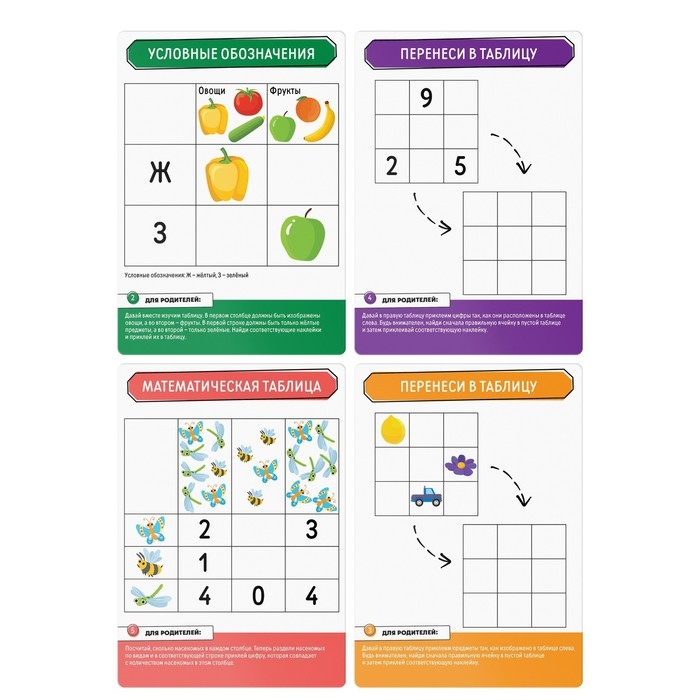 Каждая карточка поможет вам организовать мини-занятия, направленные на развитие логического мышления. Такие игры помогут научиться видеть строки и столбцы в таблице, выделять закономерности и составлять схемы.
