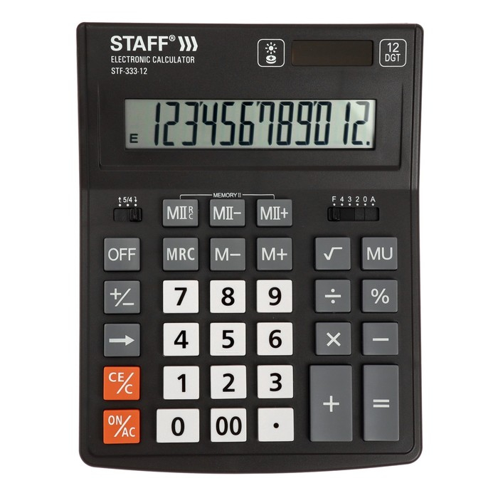 Настольный калькулятор STAFF PLUS STF-333 популярен как среди бухгалтеров, так и среди продавцов, банковских и офисных сотрудников. Имеет две независимые памяти, возможность установки режимов округления и ограничения количества знаков после запятой, клавишу корректировки введенного последнего знака, клавишу "Два нуля". Разрядность дисплея - 12 выводимых на табло цифр, позволяет работать с крупными числами. Клавиша вычислениея MU предназначена для финансовых расчетов с учетом торговой наценки. Для экономии энергии предусмотрены два источника питания: солнечная и алкалиновая батареи. Благодаря крупному дисплею и клавишам настольный калькулятор легок в использовании. Черно-серый цвет модели отлично впишется в офисный и домашний интерьер.