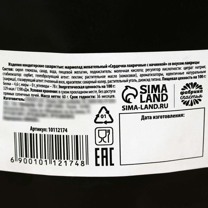 Состав: сироп глюкозы, сахар, вода, пищевой желатин, подкислитьель: молочная кислота; регулятор кислотности: цитрат натрия; стабилизатор: сорбит, гелеобразующий агент: пектин; растительное масло (кокосовое), ароматизаторы, идентичные натуральным (лакрица), глазирующий агент: пчелиный воск, красители: сахарный колер, растительный уголь, диоксид титана.